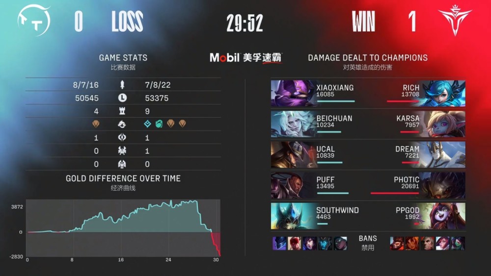 本场比赛六级前相安无事,6级后卡牌率先动上路配合小祥击杀了Rich的格温,随后南风一波精彩的游走,刚好碰到Karsa先手,反手一套控制击杀波比。