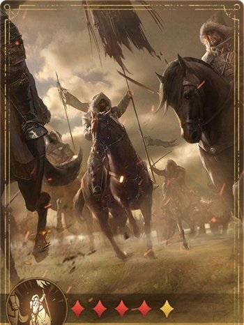 我军兵种为骑兵时生效。提高我军全体人物暴击率(星级可增加提高幅度)。进入战斗时,额外提高我军全体人物普攻和追击技能造成的伤害(武力加成),超过时限后效果消失。