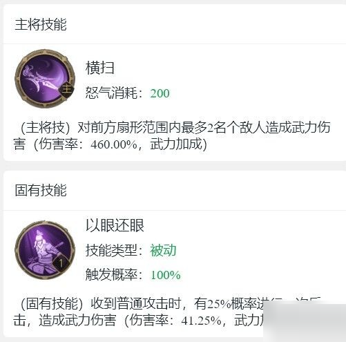 横扫对前方扇形范围内最多2名敌人造成武力伤害(伤害率460%,武力加成)