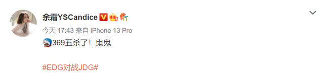 余霜则是在“室友”管哥发博以后也是感叹道:“369五杀了,鬼鬼”。这不得不让人感慨确实是“心有灵犀”,就连语气词都是用的同一款。至于在二路解说的德云色,在看到369船长五杀后也是第一时间锐评:“怎么感觉369的船长比Bin熟练度要高一些?”随着JDG以2-0战胜EDG,赛后很多网友也是认为德云色的评价可以说是相当中肯了。