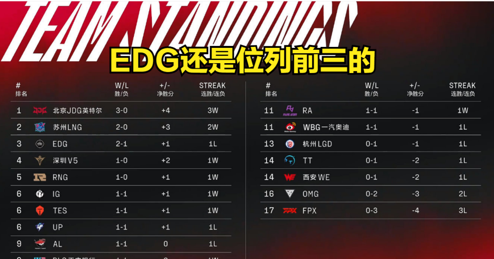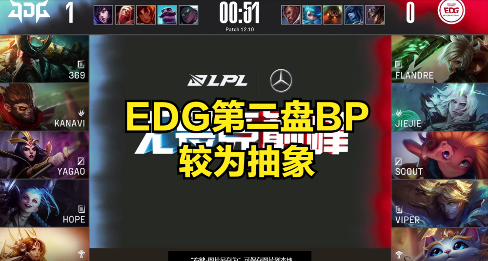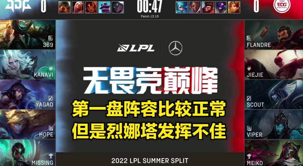 因为JDG上次和上赛季垫底的LGD战队是战成了2:1,和EDG这场比赛战成2:0.因此,按照因果关系,一物降一物的基本逻辑推理,纸面上看,好歹LGD还赢了一个小局,EDG比LGD还弱?难道冠军阵容的保持期那么短?就算要玩新的黑科技,为什么不是第一盘就亮出来吓一下JDG,偏偏要胜点局拿出来?粉丝对EDG的诟病大多数是第二盘的BP。