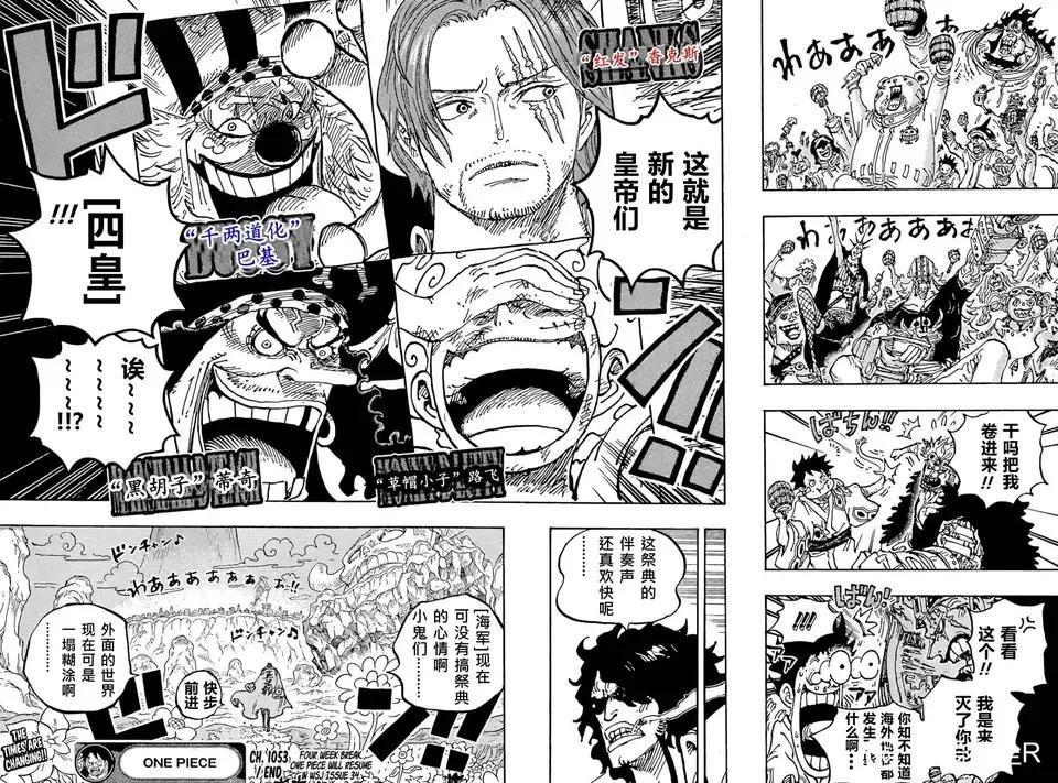 海贼王1053话汉化版已经更新,这一话的内容太劲爆了,新世界迎来大变动,四皇凯多和大妈双双倒台,新四皇呼之欲出,分别是红发香克斯,黑胡子帝奇,草帽小子,小丑巴基。新闻大王摩根斯已经将这些消息传播到世界各地,众人看到报道后,无不震惊,没想到凯多和大妈会被草帽一伙击败。