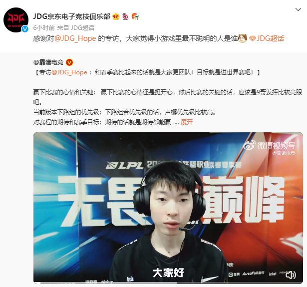 值得一提的是,Hope在采访中有提及JDG战队在夏季赛的目标。Hope透露,夏季赛的比赛是希望都可以赢下来的,然后目标是进世界赛。如果说在夏季赛开赛之前,Hope说目标是晋级S赛,或许会有部分水友质疑其是否具备着这样的能力,但是以如今JDG击败EDG的势头,以及Hope、369等选手们极佳的竞技状态来看,JDG晋级S12世界赛指日可待!
