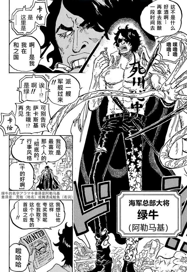 而从绿牛与海军的对话来看,他的思想也属于那种比较偏激的类型,他甚至认为现在的大将都太仁慈了,面对海贼都打不起来,因此比起其他人,他更认可赤犬的强硬做派。可是他显然没真正理解赤犬,赤犬是疾恶如仇,但并不滥杀无辜,而自他当上元帅后,也改变了不少。以这次和之国篇来说,绿牛临行前,赤犬还叮嘱他不要乱来。所以在我看来,绿牛算是真正意义上的、灰色地带的海军,甚至他的某些行为已经和反派无异了。