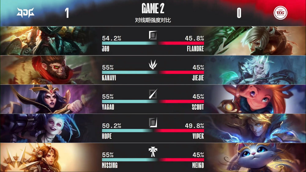 背水一战的EDG,在第二局中依旧没有找回状态,被JDG从头碾压到尾!从对局中不难发现,EDG除了在前10分和JDG打得有来有回之外,从JDG在野区抓死了佛耶戈之后,EDG就失去了比赛节奏,随后JDG接管了比赛!最终37分40秒的时间内,JDG以10K做鱼的绝对优势,完全碾压了EDG豪取连胜!
