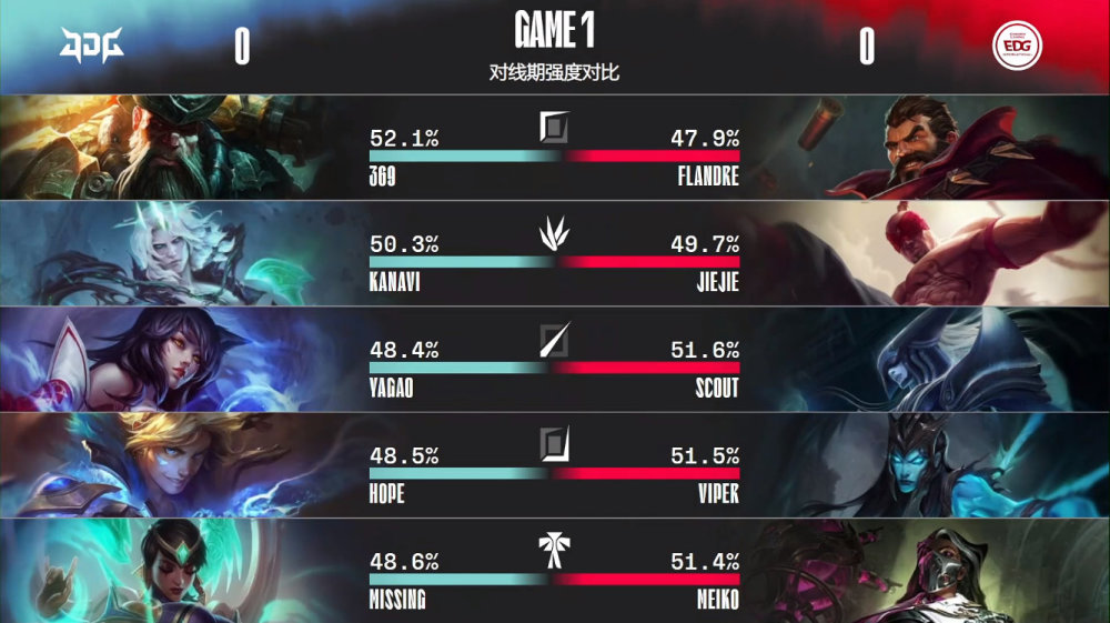 第一局比赛,JDG蓝色方,禁用泰坦,吸血鬼,岩雀,布隆,赛纳,选用369船长,Kanavi佛耶戈,Yagao狐狸,HopeEZ,Missing卡尔玛;EDG红色方,禁用曙光,牛头,猴子,卢锡安,格温,选用Flandre男枪,Jiejie盲僧,Scout冰女,Viper滑板鞋,Meiko烈娜塔。