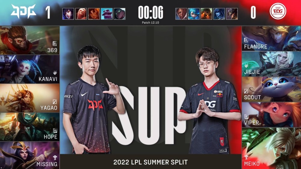 比赛的前期阶段,Jiejie率先发难,针对上路369成功完成击杀,但是Kanavi直接强行越塔血量健康的EDG下路,Scout选择TP保护,结果还是没打过,被对手打出1换2,佐伊也阵亡。