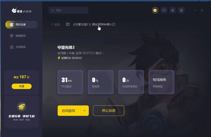 1、下载打开暴喵加速器,搜守望先锋2完成加速,点击测试资格申请入口进入