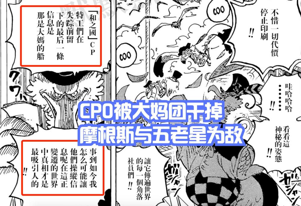 所以尾田在1053话由摩根斯提及划水很久的大妈海贼团,他们一直都在和之国近海,面对CP0,瞬间就将其击溃,只留下【那是大妈的船】的留言,随后CP0组织离奇失踪,大概率被斯慕吉等人灭掉了!