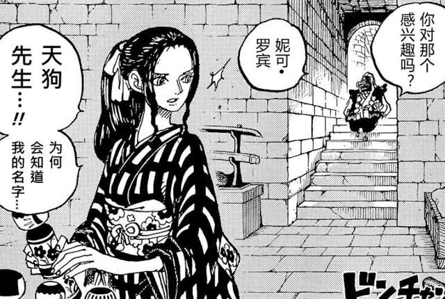 飞彻其实就是御田的父亲光月寿喜烧,原本该在20几年前就死去的人突然出现,罗宾倒是有点吃惊。其实寿喜烧是死里逃生,只不过他逃出来之时,御田已经没了。对于光月寿喜烧的故事,罗宾兴趣不大,她所在意的就是古代兵器冥王的所在地。