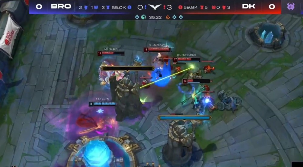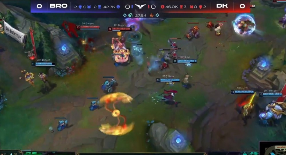 最终是BRO战队没有忍住,选择抱团打大龙,打大龙的过程中DK支援赶到,BRO被包夹,虽然拿下了大龙,但是阵型不好,被DK战队快速击杀两人,之后再留住一人击杀,打出3-0的比分后,因为复活时间比较长,直接选择一波结束了比赛。