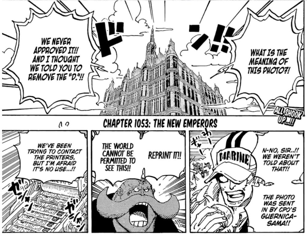 海贼王1053话终于和大家见面了,这一话内容也挺多,五老星暴怒,新的海上皇帝公布,绿牛现真容,古代兵器冥王现身和之国。