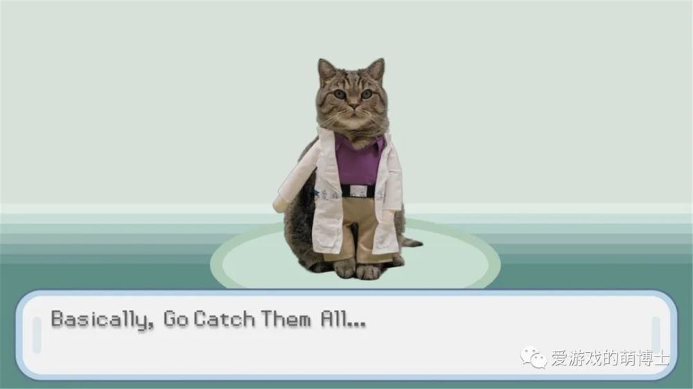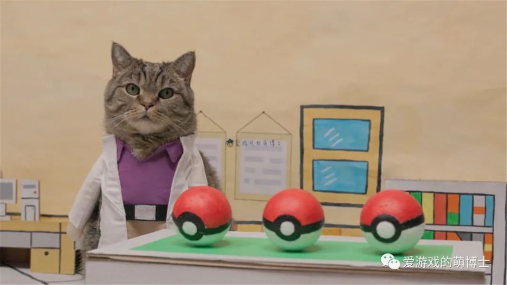 游戏里所谓的喵星人并非3D模组,而是“GoroandLuca”自己家里养的宠物。没错,创作者玩起了猫咪Cosplay,扮演了《宝可梦》游戏里的各种角色,比如:主角、宝可梦,甚至还有大木博士!然后他让喵星人在自己搭建的“游戏环境”中“演戏”,重现了《宝可梦》游戏的经典桥段。