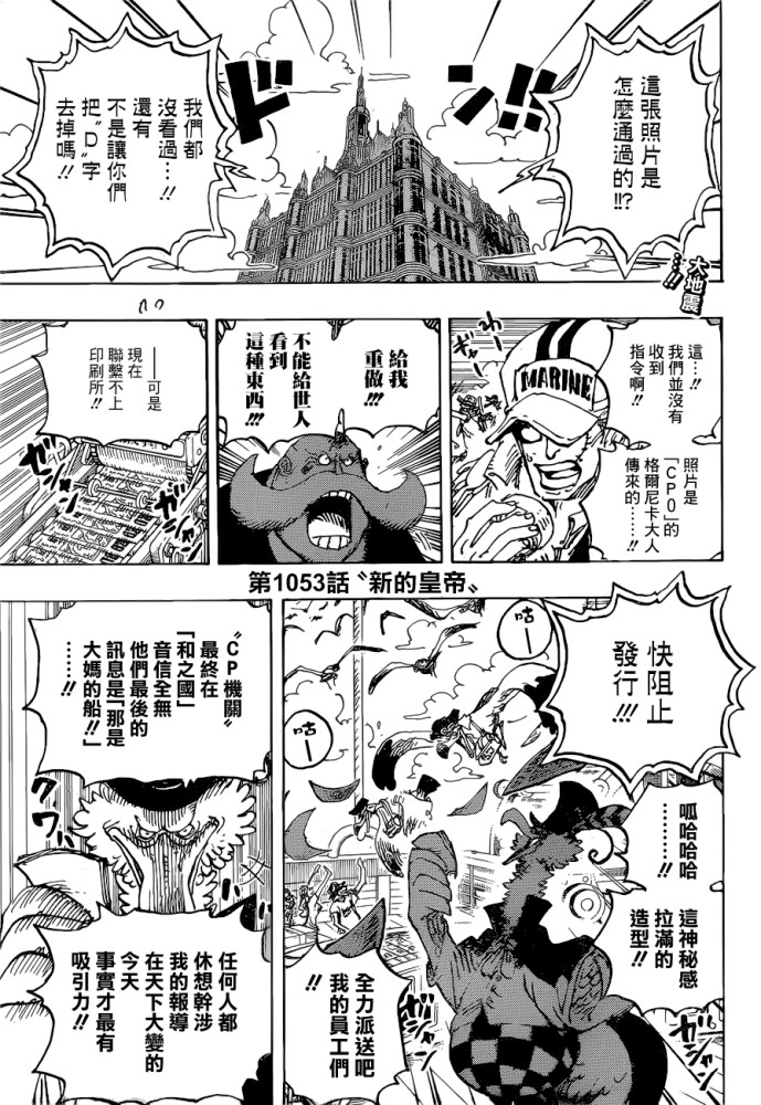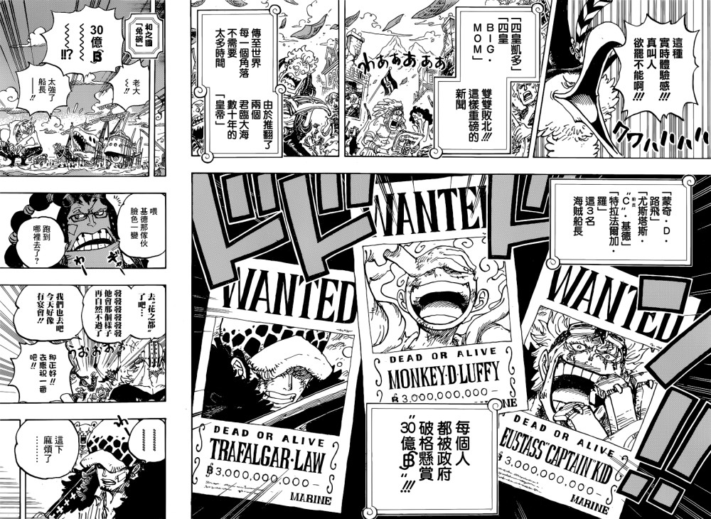 世界第一报社老板摩根斯为了新闻的爆炸性和时效性依然发行传播,路飞、基德、罗的新悬赏金都是30亿。