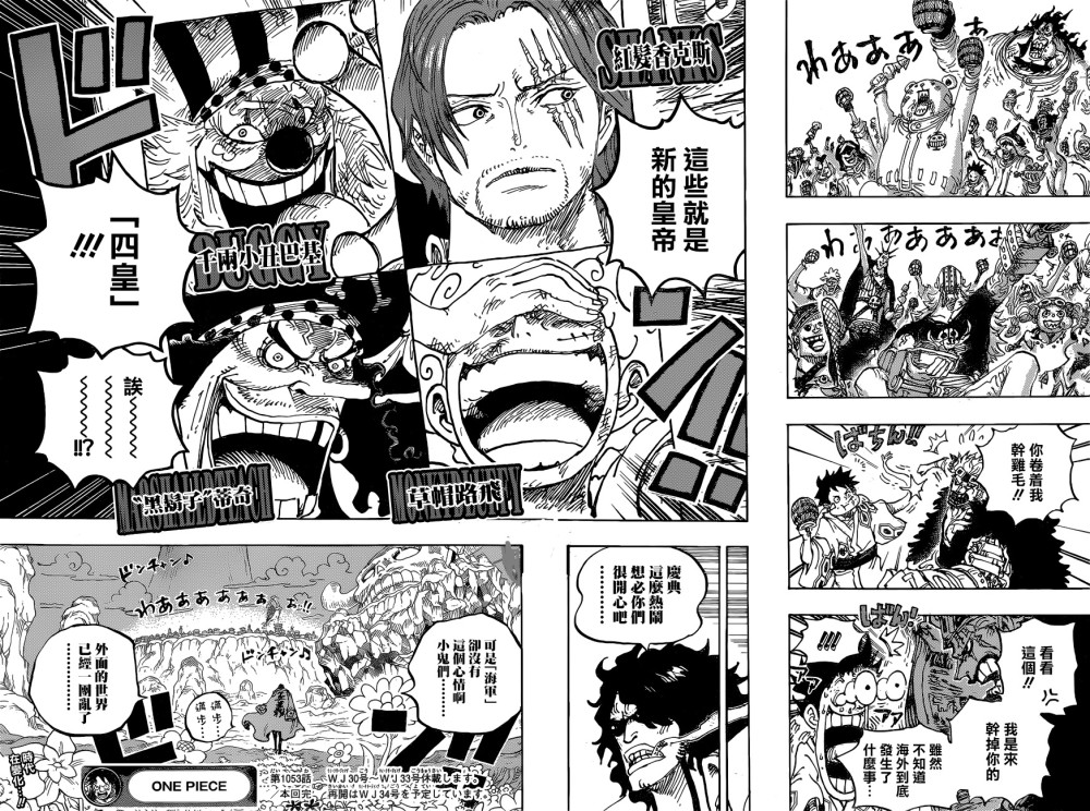 小丑巴基和路飞接替凯多和BigMom成为新四皇,赏金相同却被称为四皇的路飞让基德很不满。