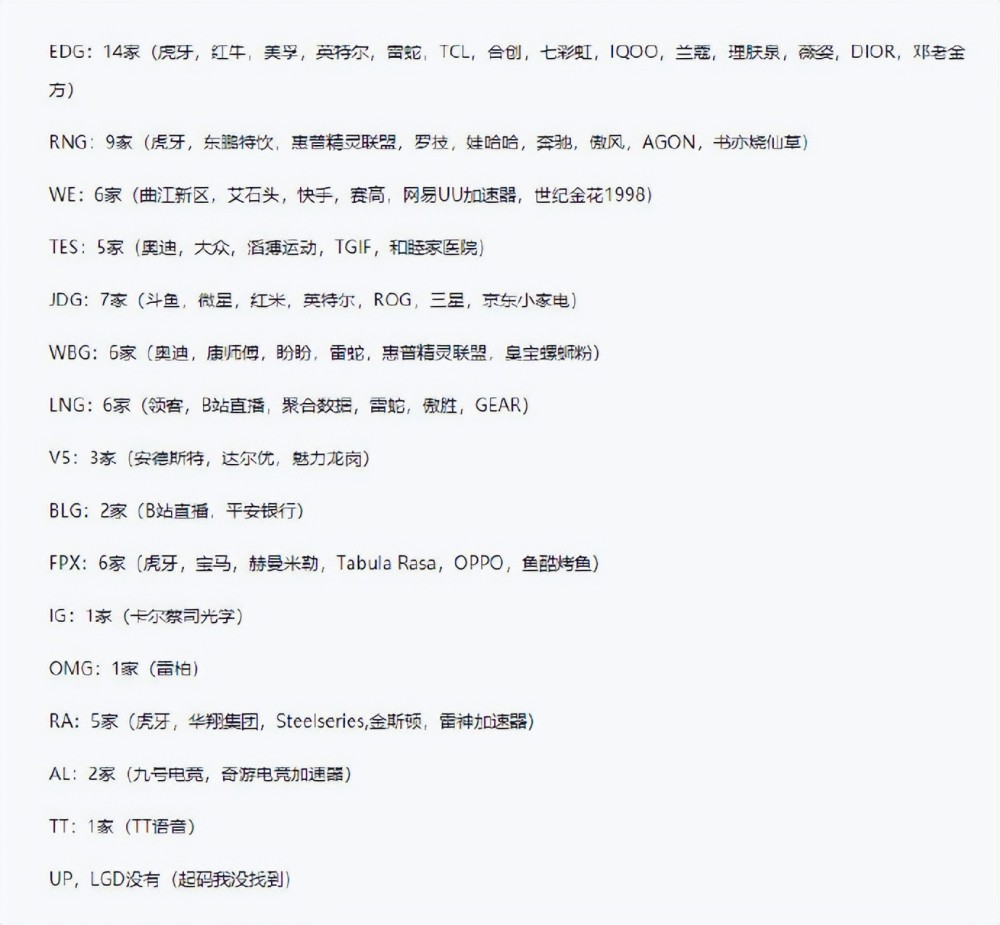 有一点让人唏嘘的就是,IG从之前的6家赞助商已经变成了现在只有1家赞助商了。具体的原因可能就是因为IG人气已经不如当年,其次,现在的IG成绩也不是那么好。最惨的可能还是UP和LGD,因为从现在的一些比赛来看,还没有发现这两家是有赞助商的,也就是说这两支队伍没有赞助商。