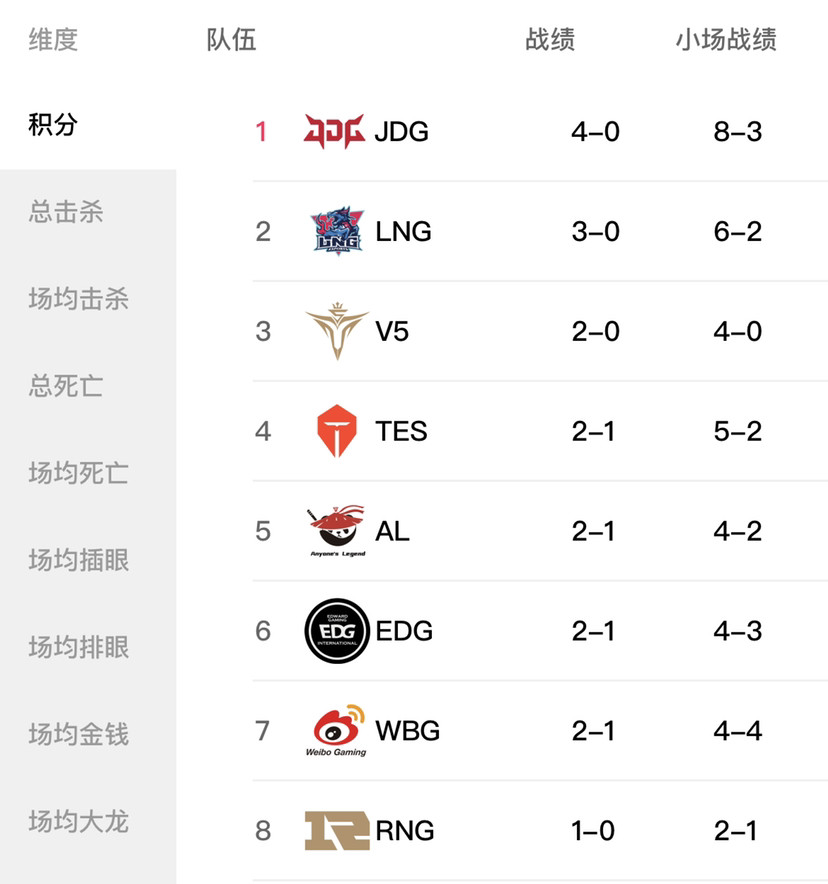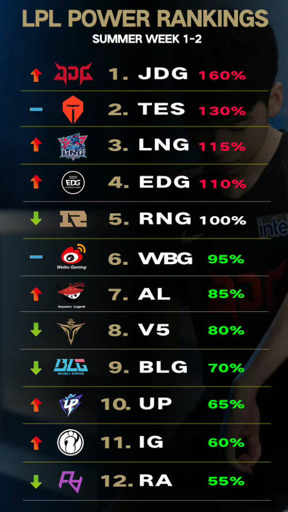 个人来看,JDG排名第一没有任何问题,毕竟头两周,JDG拿下了TES,拿下了EDG和LGD,TES和虽然输给了JDG但是打得有来有回,而且TES其他两场比赛都十分干净利落拿下,排名第二也没什么问题,虽然LNG3-0,但是从具体比赛表现来看,并没有很出色。而反观BLG则是遭遇滑铁卢,全队全靠辅助在carry。只可惜RNG只进行了一场比赛,不然应该排在第一的。不知道各位小伙伴们觉得如何?