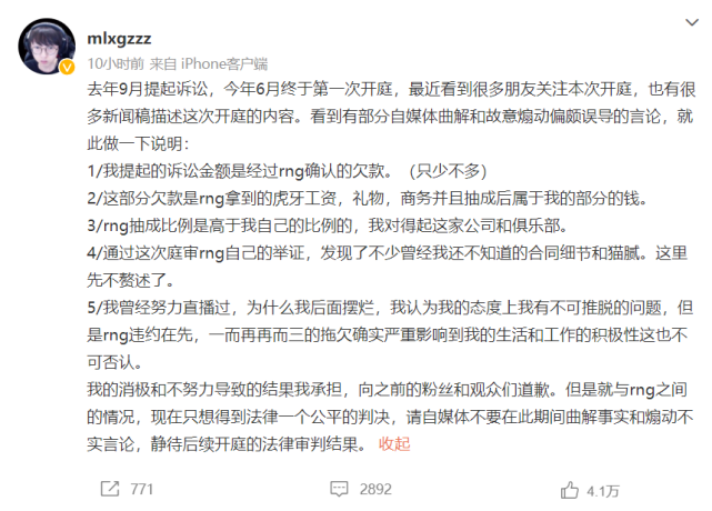 在之前就一直听说Mlxg跟RNG之间的欠款已经有所调解,不过在近日锅老师首度亮相谈到此事,他表示事情还没有解决,自己还是会用法律途径来争取自己的东西!而且自己要的东西只少不多,他认为自己对得起公司也对得起俱乐部!同时他也检讨自己,这几年因为这些事情,导致心态一度崩塌,所以就有点摆烂了!但是RNG违约在先,一而再再而三的拖欠确实严重影响到我的生活和工作的积极性这也不可否认!大家怎么看待这个事情呢?
