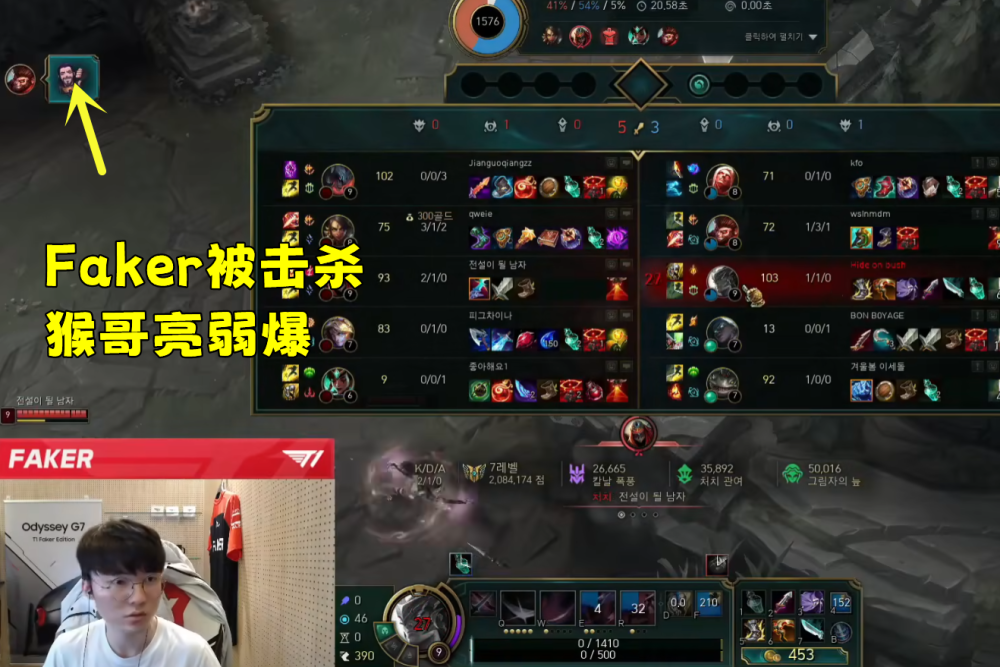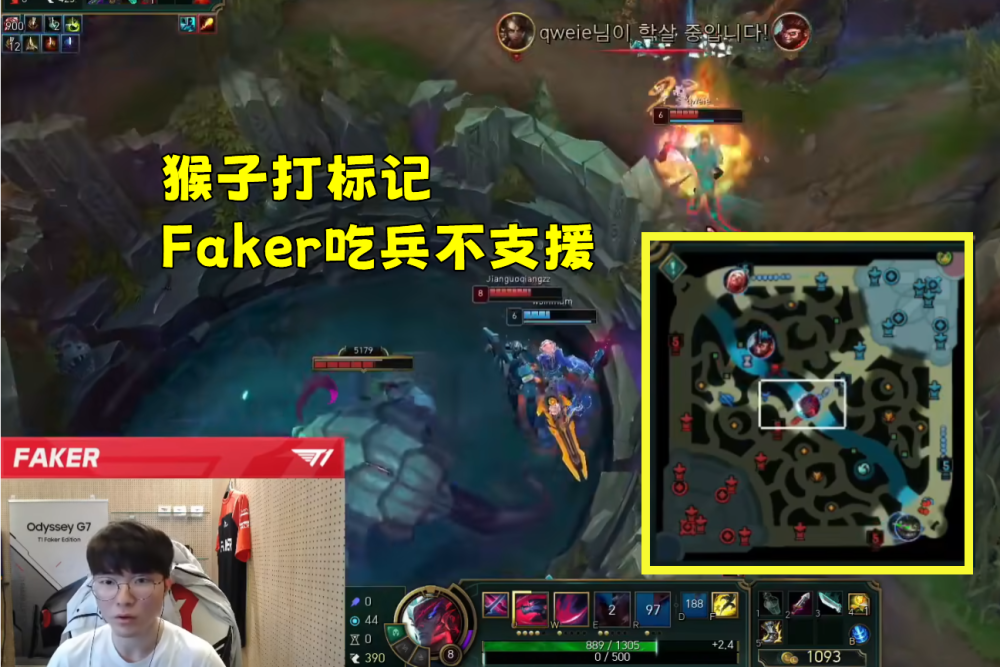 看到这个结果后,Faker是很难受的,直呼自己对线打的挺好的,却被影响了。而在双方再次上线后,猴哥在野区碰到了对面劫,有了大招之后,猴哥自然是不虚劫的。再加上李哥支援了一波,以至于轻松就拿到了劫的击杀,人头被李哥收下。看着对面中单死了,猴哥便打了一下先锋标记,想让李哥帮忙打一下。可Faker却选择了中路吃线,没有去帮助猴哥,导致猴哥被对面上野抓住,直接阵亡。