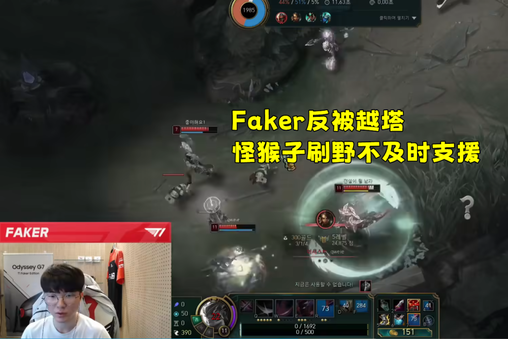 先简单介绍一下关键性人物,Faker中单永恩,己方打野猴哥是一名LOL主播,名为“小逸出击”。 在前期的对线中,Faker对线劫打了个正常发育,双方谁都奈何不了谁,但猴哥的一波五级入侵,却令对局发生了改变。由于是猴哥入侵对面野区,自然劫的支援速度要更快一些,在劫的全套技能加点燃伤害下,猴哥被打出了击杀。Faker也因此被打成三分之一血,被迫回了一波城。