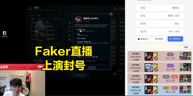 同时有不少网友开始心疼打野猴子玩家,因为在这场排位结束之后,Faker也是直接给观众们上演“正义之行”,现场把打野猴子的游戏账号进行了封禁,我个人也是搜了一下猴子这个ID,发现自从被Faker举报之后就再也没有上限了。(Faker和打野猴子最大的矛盾,其实还是先锋团Faker不去支援猴子导致猴子被敌方打野杀死,按道理来讲猴子帮Faker杀对面中单用了闪现+大招,Faker正常来讲应该帮助打野去拿先锋而不是贪兵线)