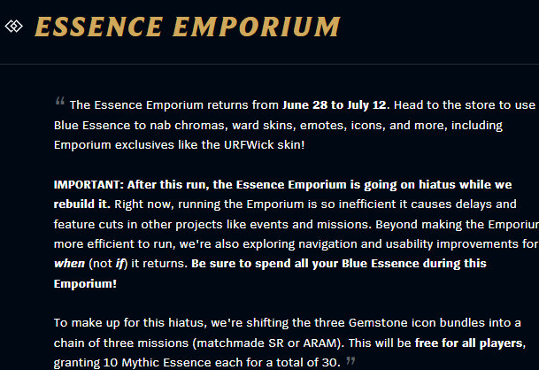 12.12版本发布上线时,外服有一条版本公告显示:蓝色精粹商店的运营效率低下,已经影响到了其他项目,因此决定在这次版本结束后无限期关闭蓝色精粹商店,直到调整完毕后重新开启。