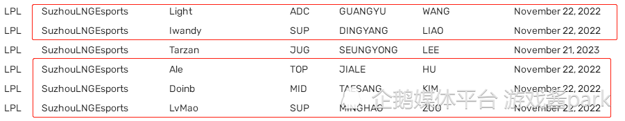 5、LNG战队,LPL合同库显示,2022年11月22日合同到期的选手有:light、iwandy、Ale、Doinb、Lvmao。首发五人组,只有打野Tarzan的合同是2023年到期。夏季赛的LNG,目前战绩3-0,暂时排在积分榜第3的位置。我个人觉得如果本赛季的lng成绩较上赛季没能取得突破,或许下赛季的阵容也会发生不小的变化。