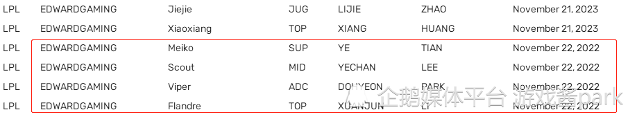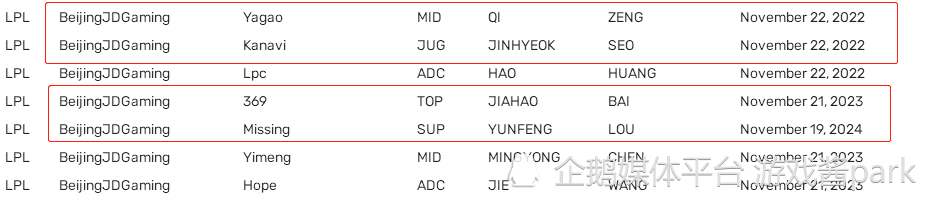 4、JDG战队,LPL合同库显示,2022年11月22日合同到期的选手有:yagao、Kanavi。上单369和下路hope的合同都将于2023年11月21日到期;辅助missing的合同持续到2024年11月。看来missing离开we之后,是和jdg签了3年的长约。讲真的,现在职业选手很少签三年那种合约了,现在都签一年的多。长约对于一些在意成绩的选手,不太好。夏赛季的jdg,状态非常好,截至6月23日,jdg战绩4-0,目前领跑夏季赛积分榜。个人感觉,jdg也是lpl赛区S12门票的有力争夺者之一。