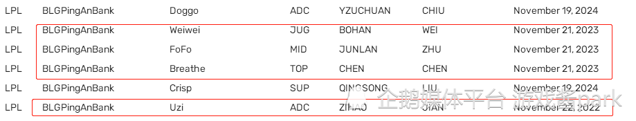 1、RNG战队,从lpl合同库可以看到,xiaohu+wei+ming+gala的合同都是将于2022年11月22日到期。前上单bin的合同到期时间也是一样的,现役上单breathe的合约将于2023年11月21日到期。懂的都懂,本赛季的rng如果没能拿到最后的那个冠军,战队续约选手压力会非常大。