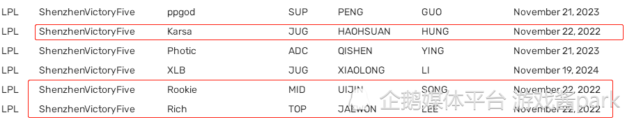 6、V5战队,LPL合同库显示,2022年11月22日合同到期的选手有:rich、rookie、Karsa。首发五人组,下路组合的合约都是2023年到期。值得一提的是,打野替补XLB跟V5签的是3年合约,2024年到期。夏季赛的v5在rookie缺席的情况下,开局打的还可以,目前也以3-0的战绩,暂时排在积分榜第2的位置。新人中单dream是V5自家青训培养的选手,打法老练,当前已蝉联了第一周&第二周最佳新秀。毋庸置疑,V5也是lpl赛区S12门票的有力争夺者之一。