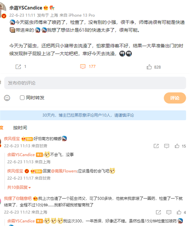 余霜表示家里进了蟑螂,所以请驱虫师上门打药了。发现家里没有别的蟑螂,师傅说可能是她买东西太多,带进了一些虫子。为了避免家里两只猫身上有虫子,他们还带着宠物去驱虫了,结果发现猫身上有脏东西,幸好去洗澡了。余霜跟粉丝吐槽说,自己请一次驱虫师花300块,结果就只用了15分钟就结束。