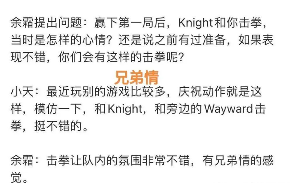 赛后采访中,lpl赛区的主持人余霜也是提到了这个问题,并且表示是不是两个人之前就已经商量好的,而小天的回应也是非常的干脆,只是气氛到了,再加上之前有过这样的操作,所以就进行碰拳。随后,余霜的兄弟情三个字直接激怒了tes战队的一些玩家,关注的粉丝应该知道,之前tes战队内部出现了一些背刺的事情,所以大量的粉丝都觉得兄弟情这三个字不应该用在这两名选手身上。说实话,感觉一些粉丝管得太宽了,选手之间的感情作为粉丝怎么知道呢?