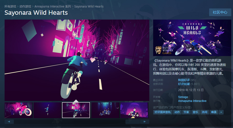 《再见,涅槃之心(Sayonara Wild Hearts)》,原价43元现25.8元。一款色彩明快的音乐类街机游戏,玩家将以每小时 200 英里的速度急速前行,体验包括骑摩托车、踩滑板、斗舞、发射激光、挥舞利剑以及击破心脏寻找和声等精彩刺激的元素。