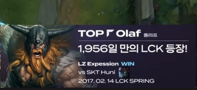 在今天DRX对阵HLE的第二局比赛中,DRX上单Kingen选出了奥拉夫。这是奥拉夫时隔1956天再次以上单位登上LCK赛场,上一次是Expession在2017年2月14日选出。