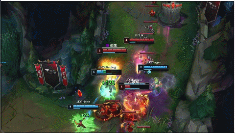 中期JDG是中路强行抓了一波霞,以佛耶戈大招强行留人在二塔位置完成击杀,但自己也被换掉了。