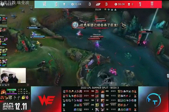前WE上单957在二路关注了这场比赛的全程,事先粉丝们也都希望Xiye和SMLZ的再次联手,能够帮助队伍取得夏季赛首胜。可事与愿违,WE被TT打得毫无还手之力。打野悲伤的状态肉眼可见地下滑,WE的整体运营节奏也跟TT有着巨大差距。