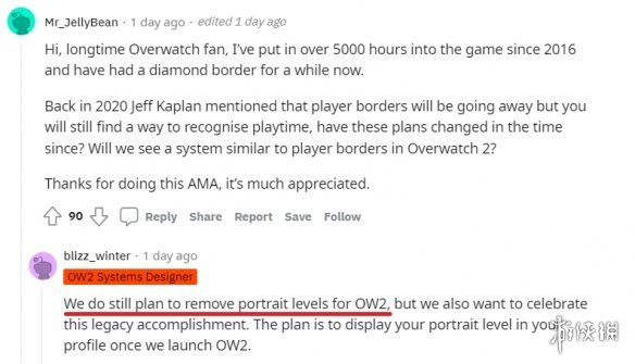 一位开发人员回复了他,表示《守望先锋2》确实会移除等级边框,计划没有改变,但在《守望先锋2》发布后可以在个人资料中显示以前获得的等级,用作纪念。