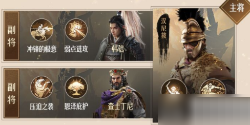 队伍依靠追击输出,混合伤害偏谋略+主将弱化,汉尼拔通过定向降低敌方主将属性,配合自身主将技效果克制单核阵容。