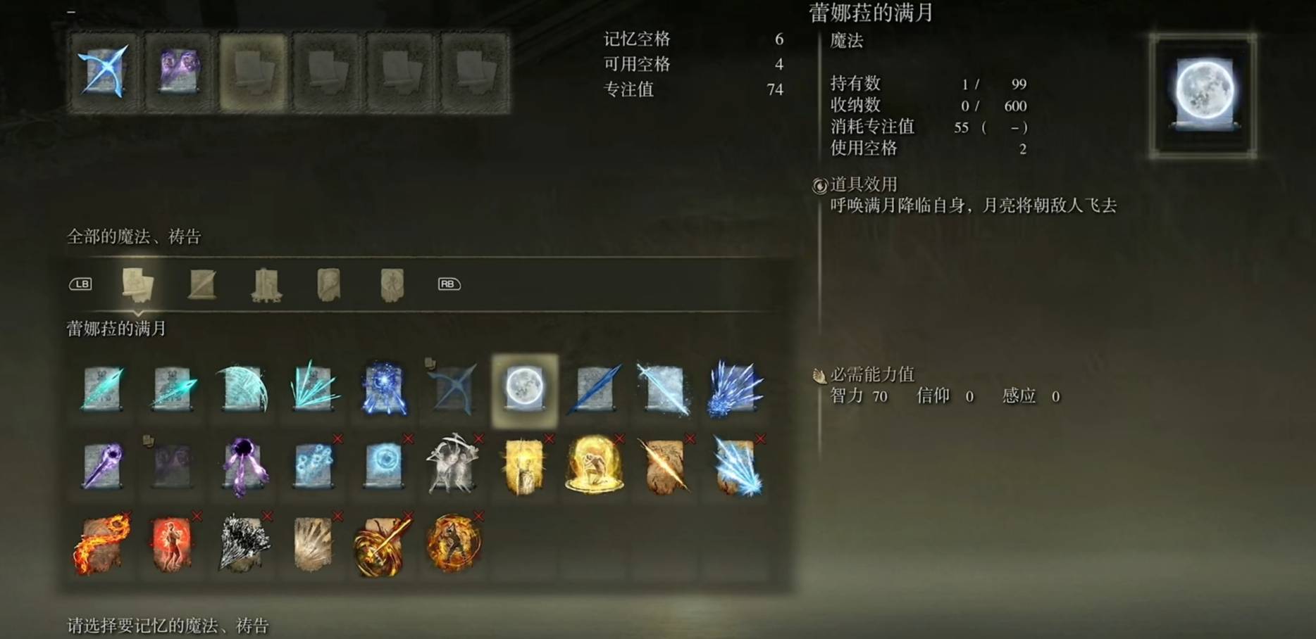 艾尔登法环满月魔法有两样分别是卡利亚权杖和雷娜菈的满月。