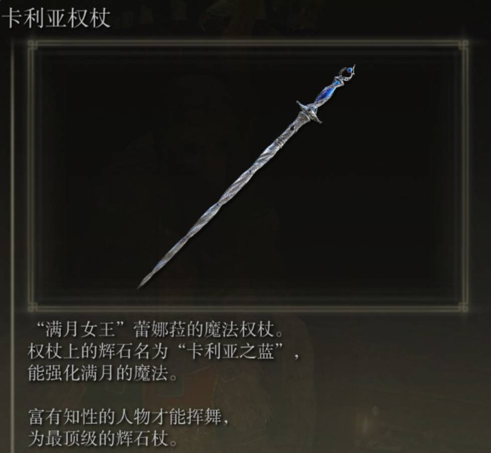 1、卡利亚权杖(满月女王法杖) 。初始为B补正,升级后补正神秘。模型好看,强化满月魔法,介绍中描述为“最顶级的辉石杖”,推测可达到S补正,但60智力的需求实在太高 掉落使用满月女王的大卢恩进行交换。
