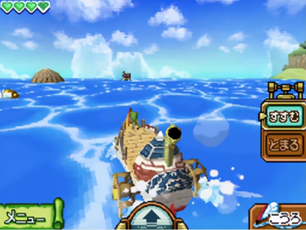 最让人惊艳的莫过于航海的部分,游戏将地图切为四等分,林克可以操作船随意在海上移动航行,且可以自己决定航线,并非固定的,自由度相当高。而海上也常常会遇到海上的商人、魔物、海盗等等,有时也会发现一些隐藏的岛屿,让人深深体会到塞尔达当初的设计初衷——探险过程中带来的惊喜。而且后期解完任务也会拿到一些道具,可以开启更多系统,像是打捞器具可以用来打捞海底的宝藏、钓竿可以用来钓海中的鱼之类的,其中鱼会在各海域中到处游走,因此要看下屏幕中的地图去追鱼,非常有趣。