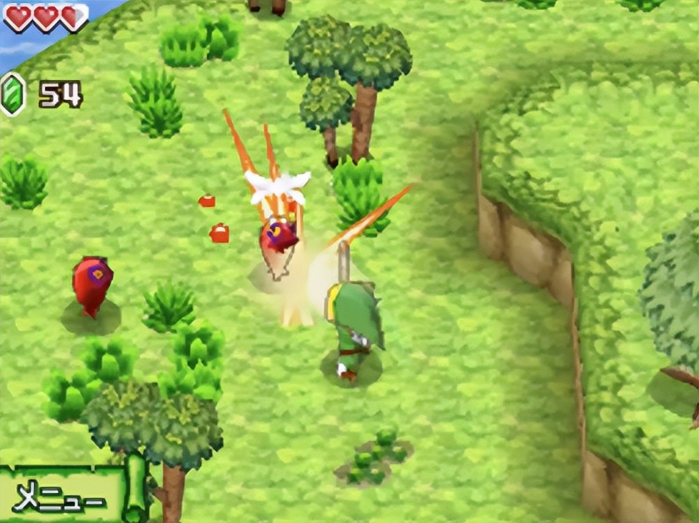 塞尔达中经典的各种炸弹、弓箭、回力镖等道具也是每一代必备的,这次可以透过NDS双屏幕的优势直接换触控更换。若真的不习惯还是可以使用L键换,算是少数有保留按键功能的地方,还有很棒的一点是幻影沙漏中可以直接在地图上做记号,一些从NPC身上听来的宝藏位置、自己有什么觉得之后可以绕回来看的地方都可以做个记号。有些还会要求要调查地图上的某些点延伸的交点,这时候就要自己先跑过地图后再一一做记号,最后再画线,真的很有探险和寻宝的气氛,这点真的将NDS触控和双屏幕的功能发挥得淋漓尽致。