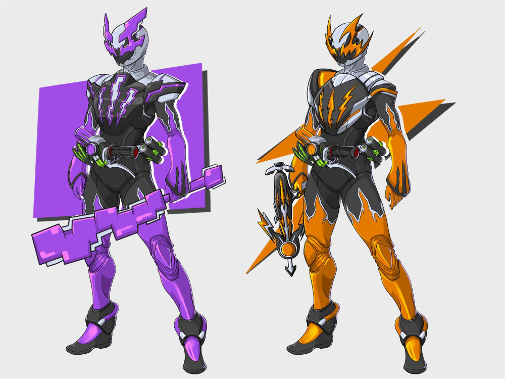 最后是同人骑士喷流的两个基础形态,变身器是Build驱动器与Accel驱动器的融合,插入不同的能量种子瓶罐会切换不同的形态,除了改变颜色,假面和武器也会有一定的变化,类似电王的基础形态设定,看起来很炫酷,是平成骑士的画风。