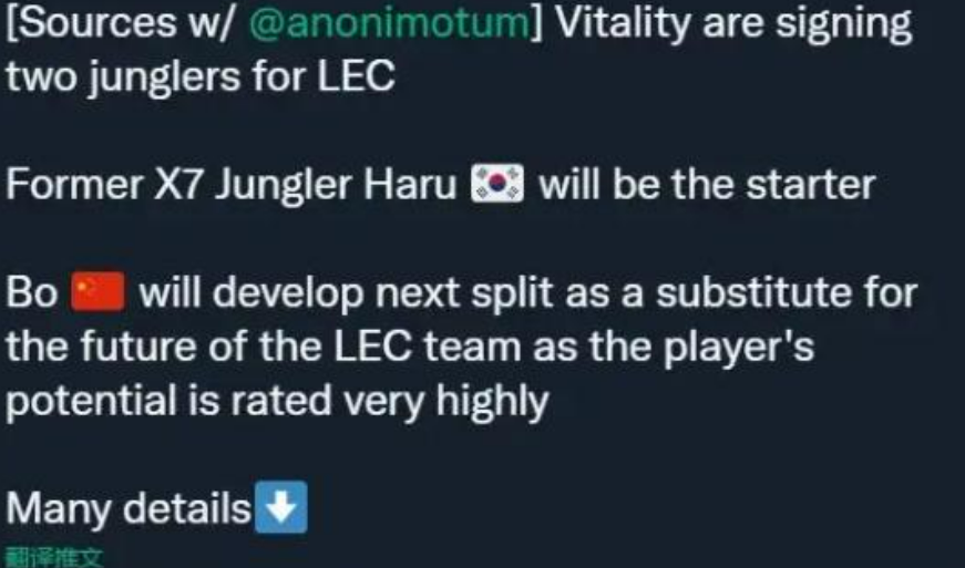 因为VIT春季赛期间最大的问题就是打野选手的硬实力不够,坐镇中路的阿P只能被对方中野捆绑在中路无法动弹,而己方打野还一直被对方入侵野区,也正是因此VIT才要补强打野一环。而博人一直被认为是最强新人打野之一,因此不少欧洲观众对于打野被补强的VIT非常关注,但实际上博人虽然签约成功,但因为签证和语言沟通等问题,无法瞬间参与战队的正赛环节,因此VIT战队还签约了安掌门的替补打野haru。但其首战表现非常难看。