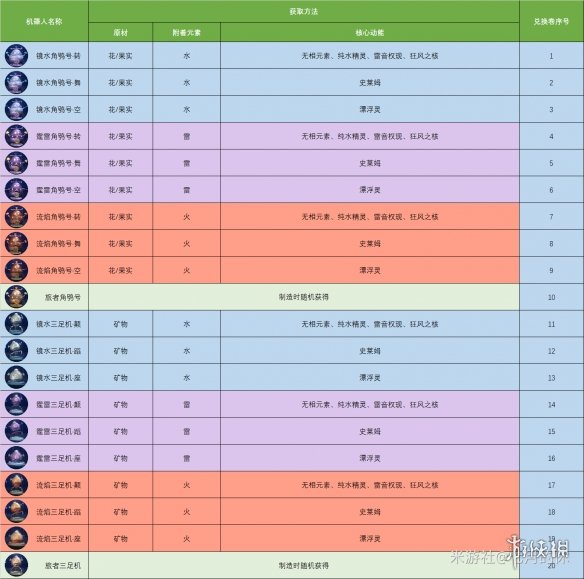 4. 机器人共2个款式:角鸮号和三足机,每款共水、火、雷3个元素,每个元素分3个不同动作的机器人,及全动作机器人。