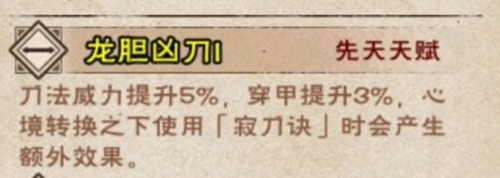 刀法威力提升5%,穿甲提升3%,心境转换之下使用【寂刀诀】时会产生额外效果(缘难断此人心境与寂刀决相合,降低自身防御-8%的同时提升攻击力6%,最多叠加5层,即-40%防御,+30%攻击)