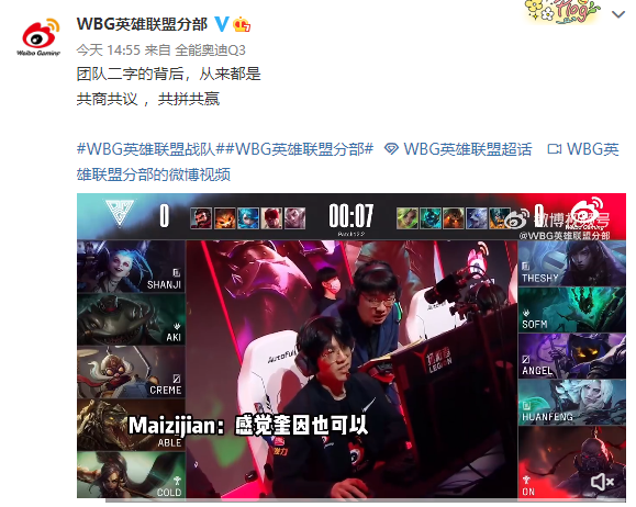 粉丝们维护TheShy和WBG,WBG官方也没有让粉丝们寒心。WBG官方连忙制作《团队二字的背后,从来都是共商共议 ,共拼共赢》视频,告诉大家,TheShy中文不错,没有干扰队伍BP,还经常选择赛恩等英雄帮助团队,冰鸟和沙皇是教练组的安排。