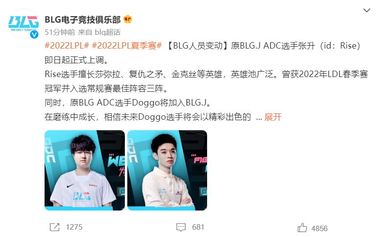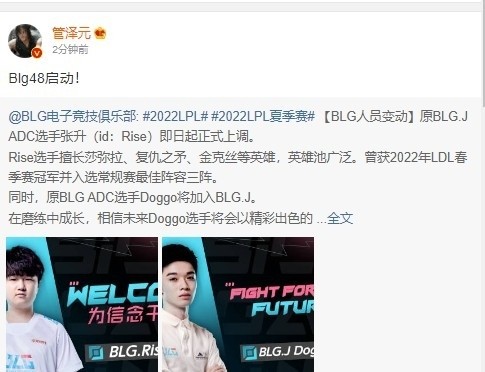 在夏季赛战绩不佳的情况下BLG选择购入自由人中单icon和上调二队打野can,这两个位置的人员变动给BLG带来一丝获胜的曙光,但是也不足以将BLG从泥潭里拖出。于是BLG继续作出人员变动,官宣原来的首发Doggo选手被下放到LDL,BLG二队下路选手Rise正式上调到一队。