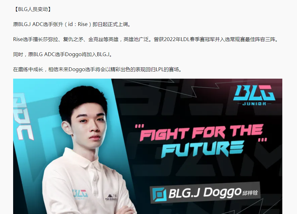 由于BLG这个赛季战绩不佳,队伍一直在寻求改变,明显感觉到无论选手还是教练,压力都还是很大。BLG引入了ICON,并且抬上了新人打野CAN来顶替掉状态不好的WEIWEI。随后又安排FOFO首发,但依然没能取得理想的效果,不少水友开始调侃BLG是不是要保DOGGO,除了刘青松之外,就DOGGO的首发位最稳。然而7月11日,BLG却官宣了DOGGO无缘首发的消息。