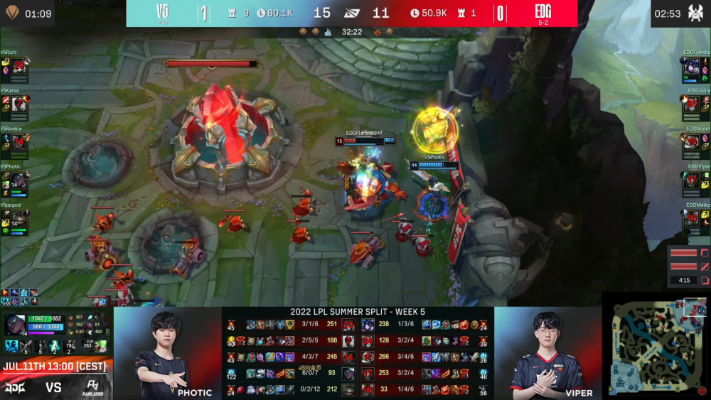 2022LPL夏季常规赛第五周的收官战在V5和EDG之间展开,EDG在此前第二周输给JDG后,也是迅速调整了状态,结果在本周却被OMG以2-1击败了,而V5目前是连胜唯一一支仍然保持全胜的队伍,尤其是在rookie回归队伍后,那种窒息的压制力,其实从上一场对阵RA的比赛中就能感觉出来了。